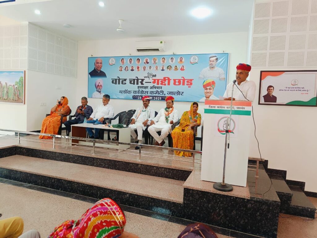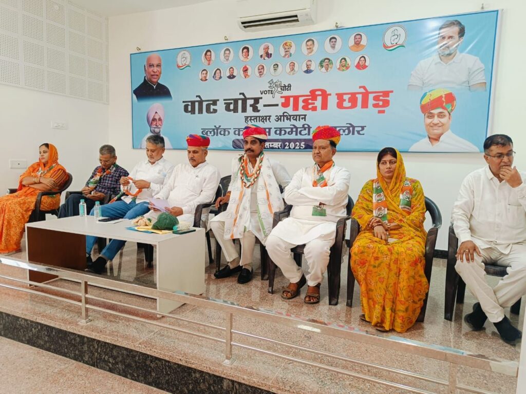 जालौर ( 20 सितंबर 2025 ) JALORE NEWS आज सायला में दोपहर 3:00 पीएम बजे भंडारी धर्मशाला में प्रदेश कांग्रेस कमेटी के निर्देशानुसार ब्लॉक कांग्रेस कमेटी बैठक एवं हस्ताक्षर अभियान कार्यक्रम विधान सभा प्रभारी बेनीप्रसाद कटारिया के मुख्य अतिथि, ब्लॉक प्रभारी योगेन्द्र सिंह कुंपावत, जिलाध्यक्ष भंवरलाल मेघवाल एवं विधान सभा प्रत्याशी रमिला मेघवाल के विशिष्ट अतिथि, ब्लॉक अध्यक्ष सवाई सिंह चम्पावत की अध्यक्षता में रखी गई।
