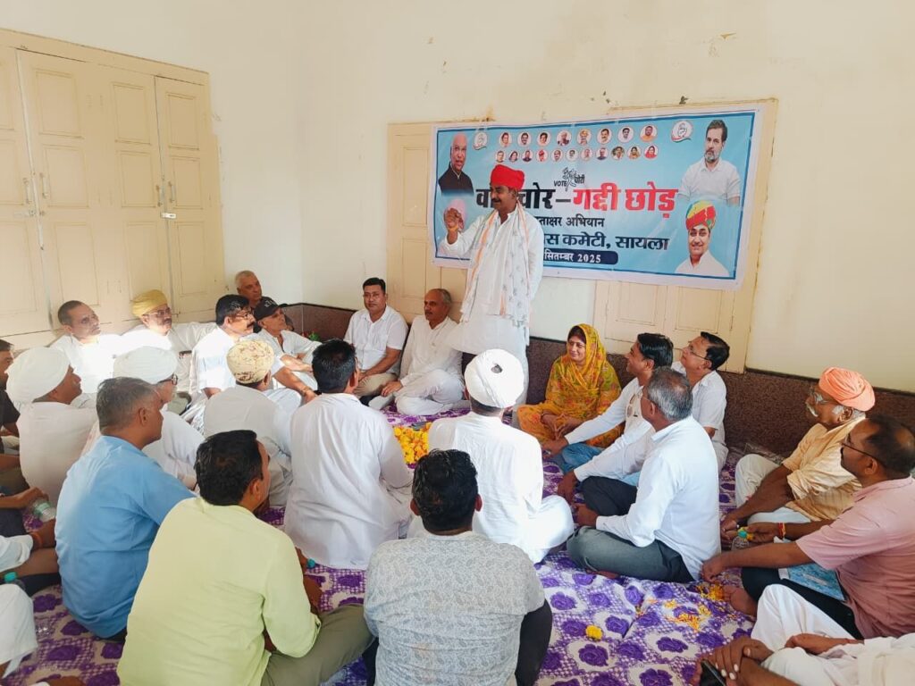 बैठक में प्रभारीगण द्वारा अखिल भारतीय कांग्रेस कमेटी द्वारा चलाए जा रहे वोट चोरी के विरुद्ध ” वोट चोर गद्दी छोड़ ” हस्ताक्षर अभियान के तहत सायला ब्लॉक के समस्त कांग्रेसजन के हस्ताक्षर करवाकर जिला कांग्रेस कमेटी के द्वारा प्रदेश कांग्रेस कमेटी को प्रेषित की ।