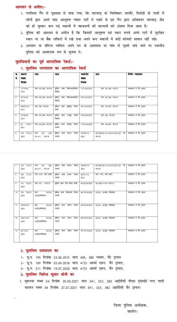 2. पुलिस की आमजन से अपील है कि किमती आभूषण एवं नकद रूपये अपने घरों में सुरक्षित स्थान पर या बैंक लॉकरो में रखे तथा अपने बन्द मकानों में कोई कीमती सामान नहीं रखे।