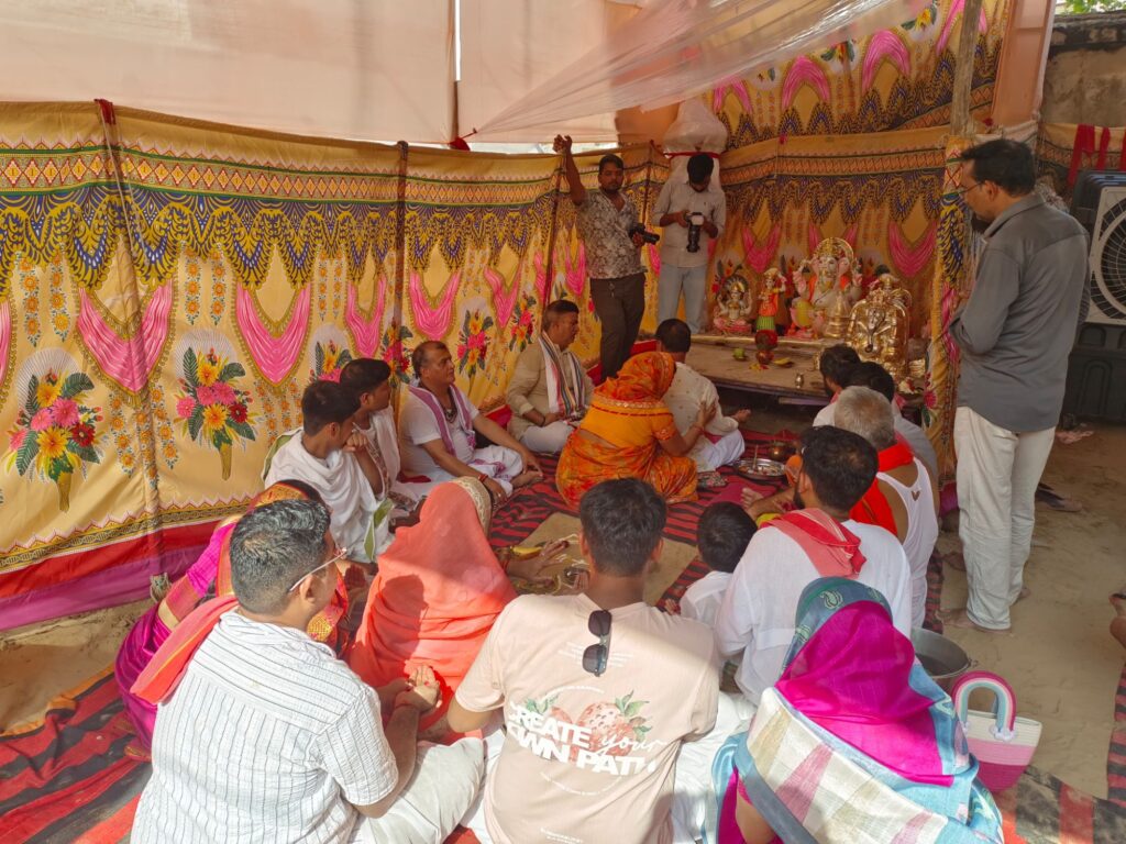 दिनभर अलग-अलग धार्मिक अनुष्ठान हुए जिनमें गणेश-गौरी के साथ मंडप प्रवेश, षोडश मातृका पूजन, अरणि मंथन से अग्नि स्थापना, ग्रह पूजन, जलाधिवास और धान्याधिवास शामिल रहे। शाम को विशेष पूजन और आरती संपन्न की जाएगी।