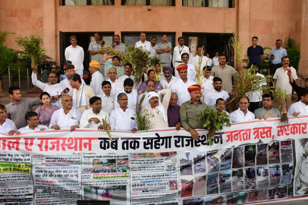 जयपुर ( 04 सितम्बर 2025 ) विधान सभा के मानसून सत्र का तीसरा दिन भी हंगामेदार रहा। नेता प्रतिपक्ष टीकाराम जूली के नेतृत्व में कांग्रेस विधायकों ने गुरूवार को सदन की कार्यवाही शुरू होने से पहले विधान सभा परिसर के बाहर जोरदार प्रदर्शन किया और प्रदेश में भारी बारिश से किसानों की फसलों को हुए नुकसान की भरपाई के लिये सरकार से विशेष पैकेज जारी कर मुआवजे की मांग की।