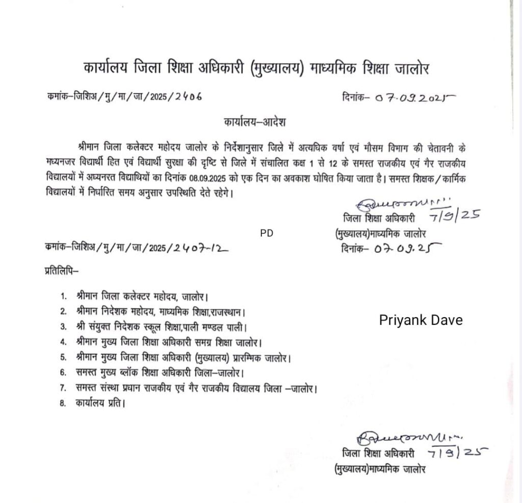 जालोर ( 7 सितम्बर 2025 ) जालोर जिले में लगातार हो रही बारिश और मौसम विभाग द्वारा जारी चेतावनी को देखते हुए जिला प्रशासन ने बड़ा फैसला लिया है। जिला कलेक्टर महोदय के निर्देशानुसार जिलेभर के सभी आंगनवाड़ी केंद्रों तथा कक्षा 1 से 12वीं तक संचालित सभी राजकीय एवं गैर राजकीय विद्यालयों में अध्ययनरत विद्यार्थियों के लिए सोमवार, 8 सितम्बर 2025 को एक दिन का अवकाश घोषित किया गया है।