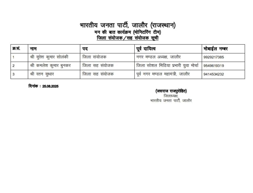 जालोर, ( 25 अगस्त 2025 ) भाजपा प्रदेशाध्यक्ष मदन राठौड़ के निर्देशानुसार भाजपा जिलाध्यक्ष जसराज राजपुरोहित ने जालोर जिले में प्रधानमंत्री नरेंद्र मोदी के लोकप्रिय कार्यक्रम ‘मन की बात’ की मॉनिटरिंग टीम का गठन किया है। इस टीम की जिम्मेदारी जिलेभर में कार्यक्रम के सफल संचालन और जनता से अधिकाधिक जुड़ाव सुनिश्चित करना रहेगा।