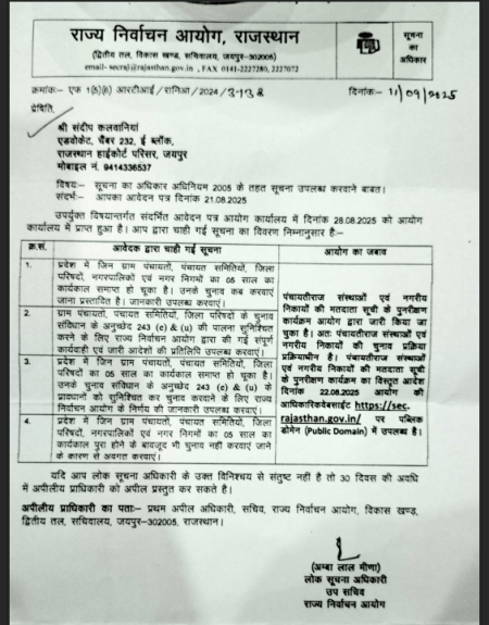 इन सवालों के जवाब में आयोग ने एक सामान्य और अस्पष्ट उत्तर दिया है। निर्वाचन आयोग ने कहा कि पंचायती राज संस्थाओं और नगरीय निकायों की मतदाता सूची के पुनरीक्षण का कार्यक्रम जारी हो चुका है। चुनाव प्रक्रिया प्रक्रियाधीन है।” आयोग ने यह भी बताया कि मतदाता सूची के पुनरीक्षण का विस्तृत आदेश 22 अगस्त 2025 को उनकी आधिकारिक वेबसाइट (https://sec.rajasthan.gov.in/) पर उपलब्ध है।